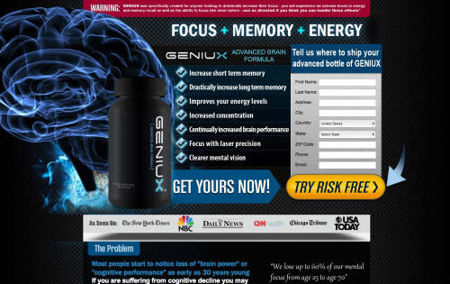 When the proper instructions are followed, Geniux pills can highly improve a person’s quality of life. Although results may specifically vary from person to person, the overall effect from the Geniux Advanced Brain Formula is indeed a positive one. The all natural ingredients work to delicately on improving brain function without harming any other parts of a person’s body. The Geniux Advanced Brain Formula is not to be used by anyone under the age of eighteen and prior consultation with a doctor may be required. To try your risk free trial of the Geniux Advanced Brain Formula click the link below.