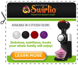 Swirlio is a countertop kitchen appliance that enables one to make delicious, soft serve desserts without having to add processed sugars, associated preservatives and dairy fats. The product is manufactured by Big Boss and distributed by the E. Mishan and Sons, Inc. Swirlio is one of the “As seen on TV” products.